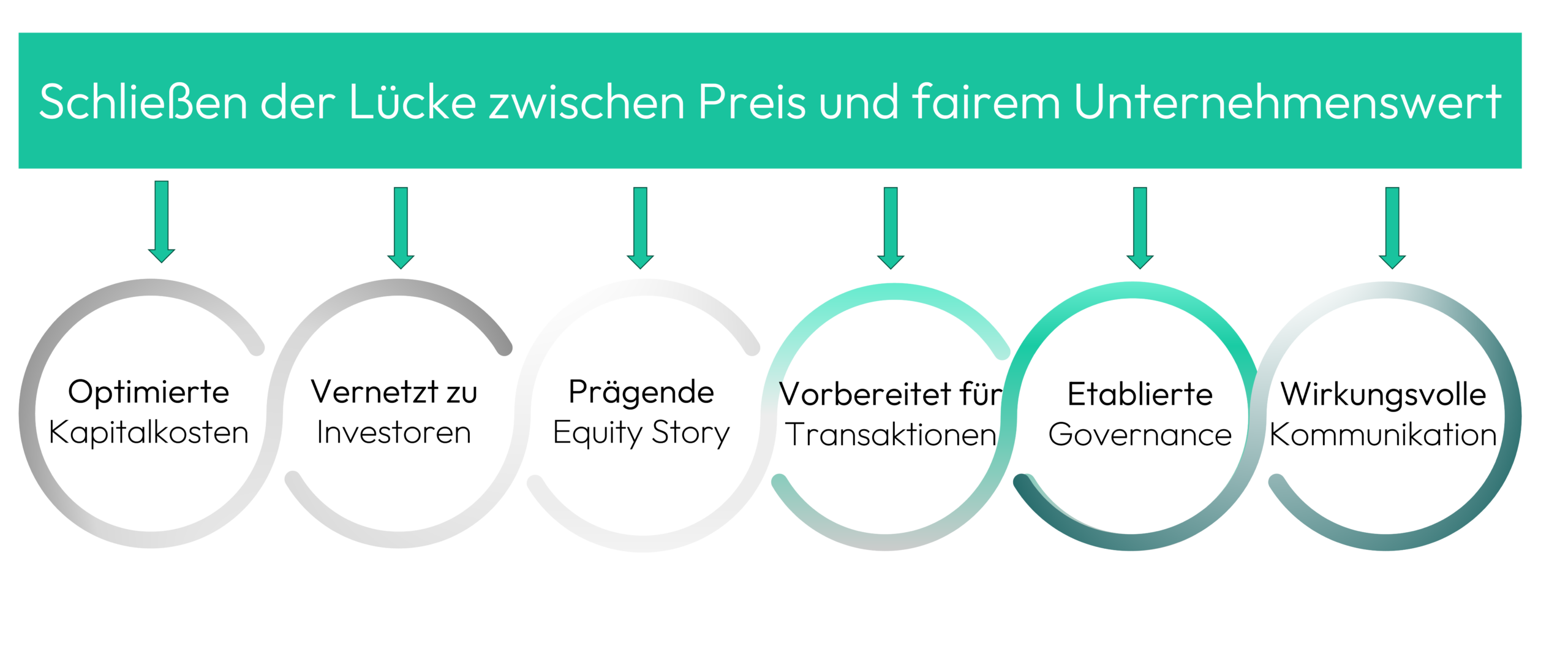 Zahlen und Daten bestimmen den Preis, den der Kapitalmarkt für Ihr Unternehmen bezahlt. Diese transferiert in wenige Worte, in eine prägende Equity Story kann viel bewirken. Es entscheidet darüber, ob die Lücke zwischen dem Preis Ihres Unternehmens an der Börse und dem fairen Wert Ihres Unternehmens schließt.